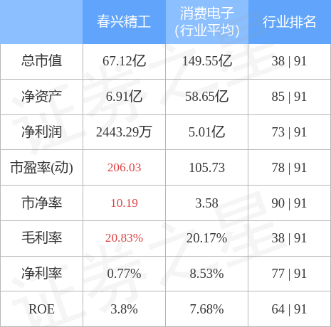 根据近五年财报数据,证券之星估值分析工具显示,春兴精工(002547)行业内竞争力的护城河一般,盈利能力较差,营收成长性较差。可能有财务风险,存在隐忧的财务指标包括:有息资产负债率、应收账款/利润率、应收账款/利润率近3年增幅、存货/营收率增幅、经营现金流/利润率。该股好公司指标0.5星,好价格指标1星,综合指标0.5星。(指标仅供参考,指标范围:0 ~ 5星,最高5星)
