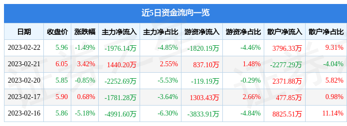 2月22日的资金流向数据方面,主力资金净流出1976.14万元,占总成交额4.85%,游资资金净流出1820.19万元,占总成交额4.46%,散户资金净流入3796.33万元,占总成交额9.31%。