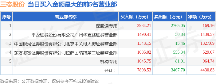 证券小知识:龙虎榜是交易所披露的竞价交易公开信息,现身龙虎榜的个股都是当日最为活跃的个股,是投资者日常重点关注的数据。交易所公布当日买入金额和卖出金额前五名的席位,其中一些席位代表特殊意义,如机构专用席位是指基金专用席位、券商自营专用席位、社保专用席位、券商理财专用席位、保险机构专用席位、保险机构租用席位、QFII专用席位等机构投资者买卖证券的专用通道和席位。深股通专用、沪股通专用为北向资金的交易席位。从龙虎榜数据可以发现和研究机构、游资和散户的资金动向。一些营业部席位经常上榜,市场知名度较高,投资者整理代表散户、游资、量化等不同资金的营业部席位。以下席位信息为市场资料整理,仅供参考。