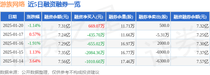游族网络融资融券信息显示,融资方面,当日融资买入1728.05万元,融资偿还1058.98万元,融资净买入669.07万元。融券方面,融券卖出3900.0股,融券偿还3400.0股,融券余量11.71万股,融券余额101.88万元。融资融券余额7.32亿元。