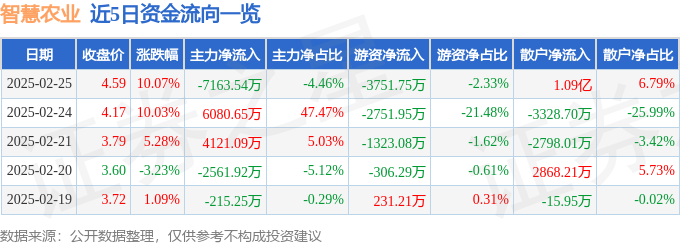 证券之星消息,智慧农业2月25日涨停收盘,收盘价4.59元。该股于9点25分涨停,4次打开涨停,截止收盘封单资金为1.03亿元,占其流通市值1.56%。