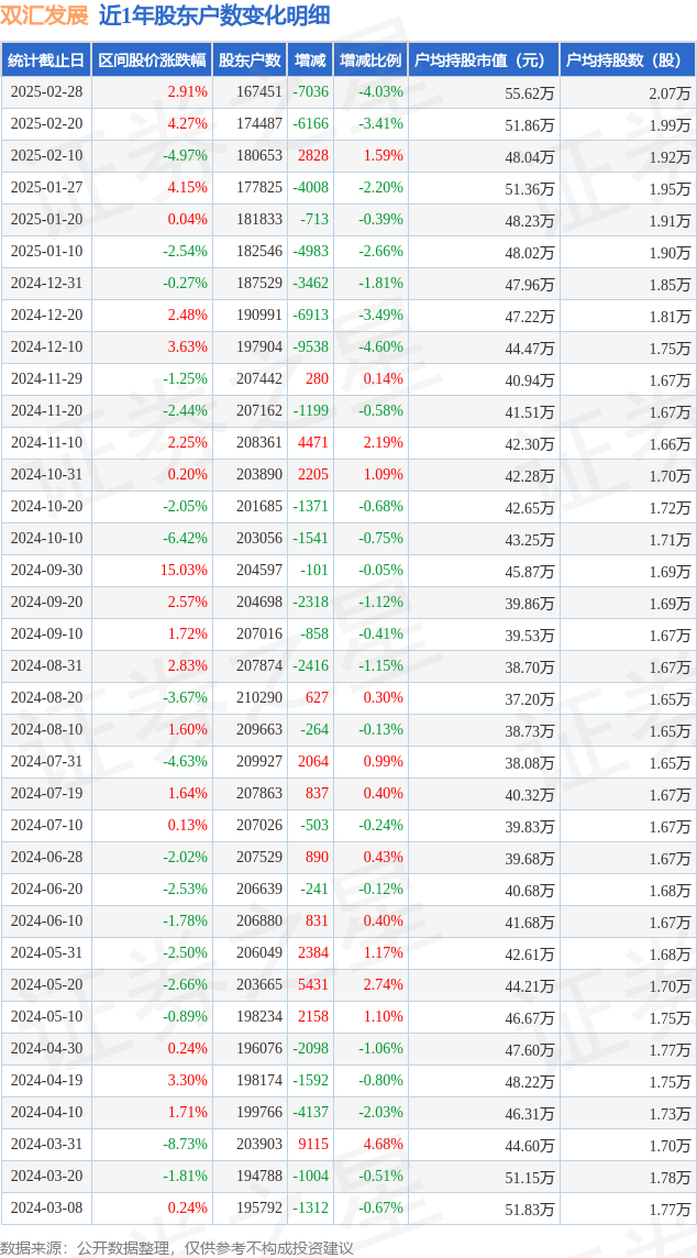 从股价来看,2025年2月20日至2025年2月28日,双汇发展区间涨幅为2.91%,在此期间股东户数减少7036.0户,减幅为4.03%。