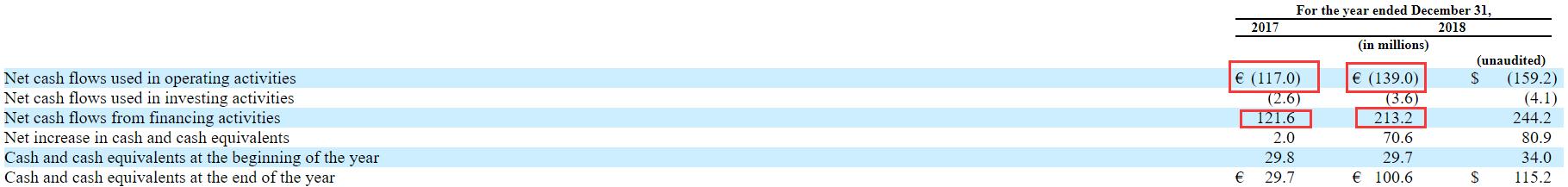 2018年,公司对外的融资额达到了2.13亿欧元,运营活动所消耗的现金流为1.39亿欧元。多融资的7000万欧元作为现金及等价物存放于公司的银行账户中。