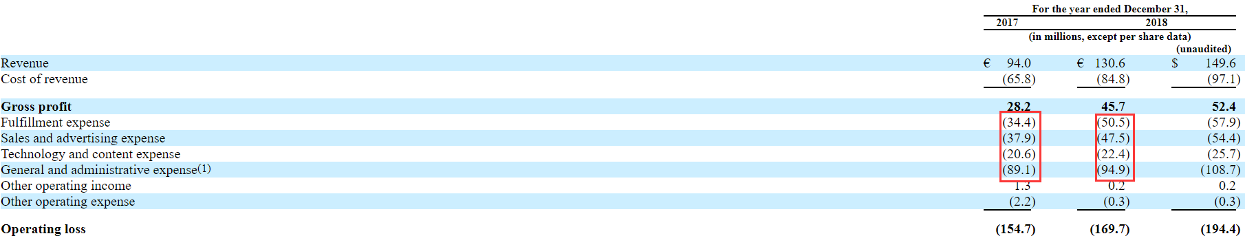 - Jumia2017及2018的毛利分别为2820万欧元和4570万欧元,对应的毛利率分别为30%和35%。公司主要的运营费用包括物流成本、营销费用、研发费用和管理费用。由于公司的销售规模仍然较小,所以公司的收入还无法覆盖所有的运营成本,导致公司运营亏损较为严重。2017年公司的运营亏损为1.547亿欧元,2018年为亏损1.697亿欧元。