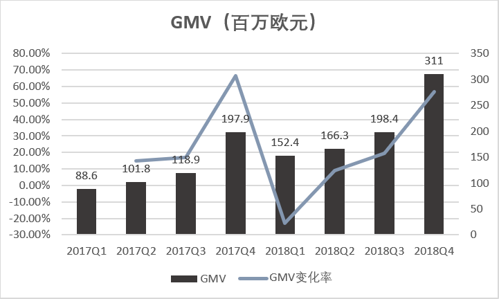 Jumia的GMV增长十分迅速,从2017年第一季度的8860万欧元增长到2018年第四季度的3.11亿欧元,季度复合增长率达到了17%。从全年来看,公司2017年的GMV为5.07亿欧元,2018年为8.28亿欧元,年增长率为63.31%。