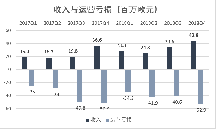 - 公司2018年4个季度的运营收入分别为2830万欧元、2480万欧元、3360万欧元和4380万欧元。公司目前还处在亏损状态,2018年第一季度公司亏损3430万欧元、第二季度亏损为4190万欧元、第三季度亏损为4060万欧元、第四季度为5290万欧元。