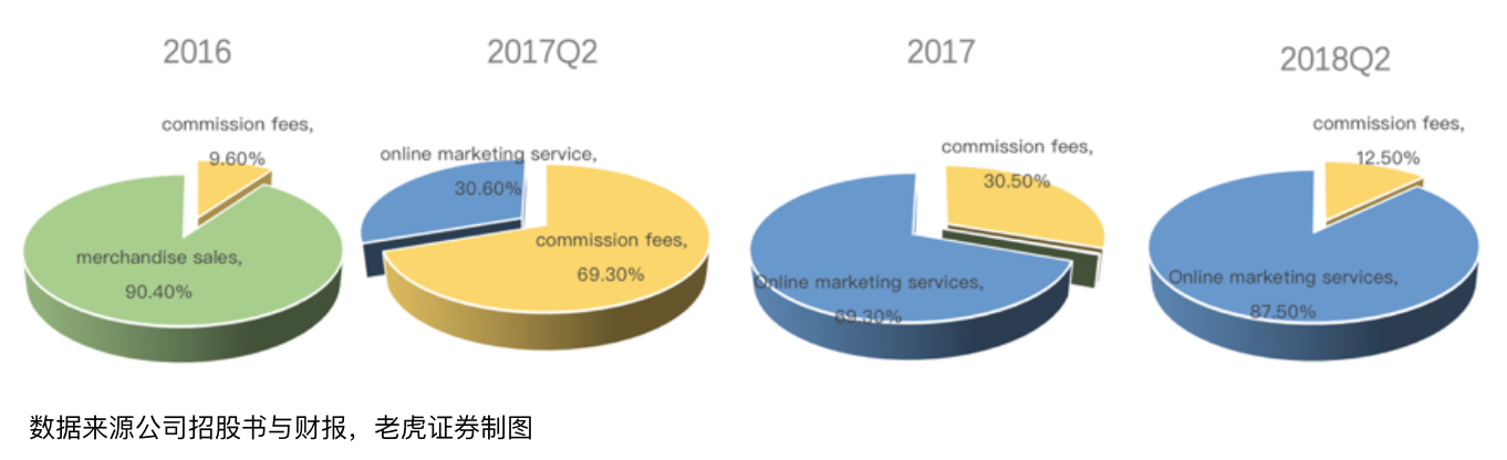 2017年起,拼多多的全面转型平台服务,到了第二季度100%收入来自线上平台服务收入,已经没有商品销售收入。