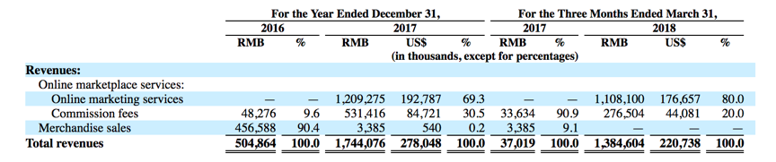 根据拼多多招股书显示,公司收入分为线上平台服务收入和商品销售收入,线上平台服务费又包括线上推广服务收入和交易佣金,模式跟淘宝如出一辙。