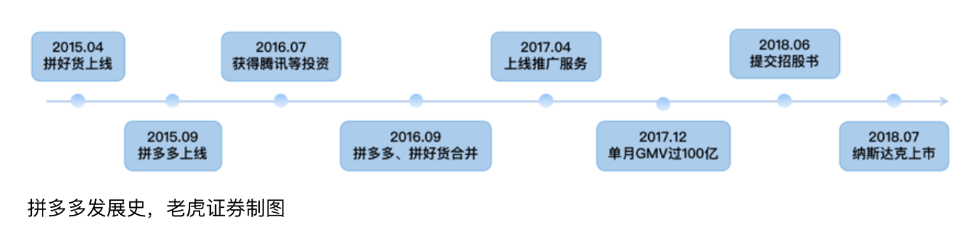 第一个阶段:拼好货、拼多多探索期,一个自营一个平台,直到两家合并。第二个阶段:裂变爆发期,2017年全面平台化,靠微信生态突围而出。第三个阶段:全民网购平台,通过品类扩张和营销推广,GMV快速突破1000亿。