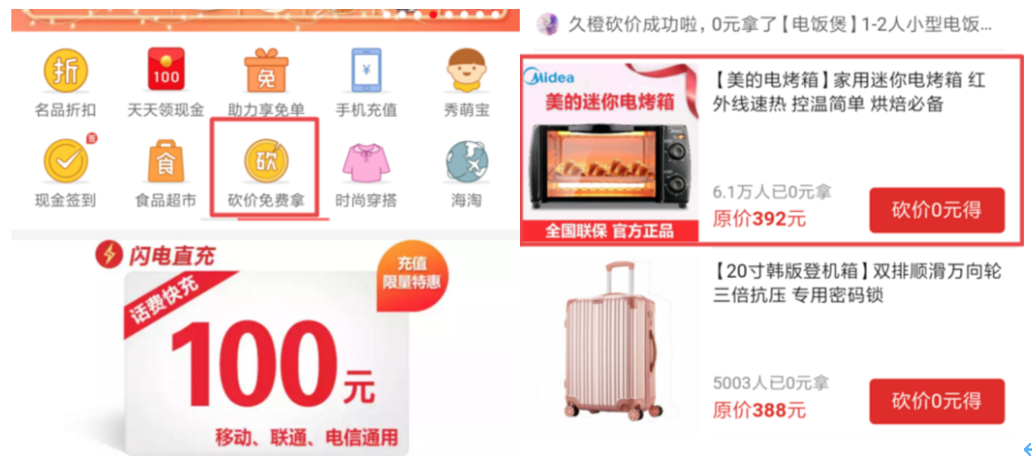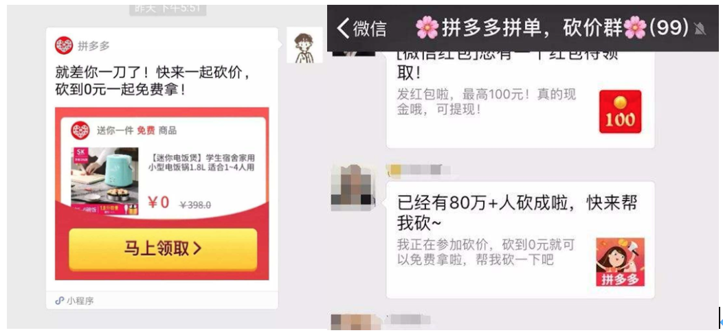 而后通过微信群、朋友圈病毒式传播,通过 “砍价免费拿”、“开团1分钟抽奖”、还是“助力免单”等模式将购物游戏化,充分利用社交关系,靠熟人带货形成裂变增长。