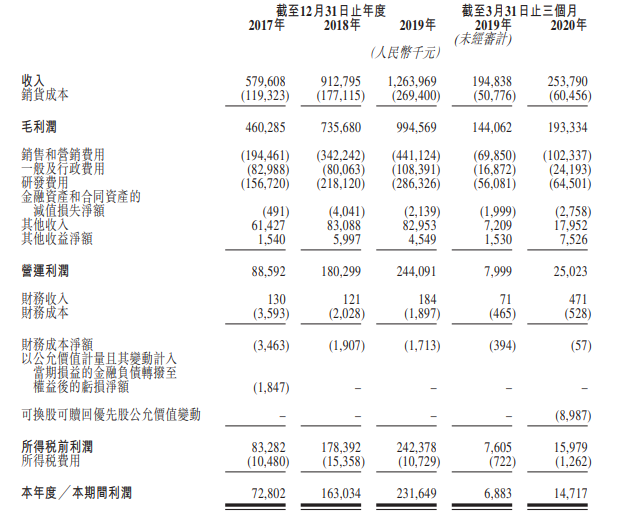 据招股书数据显示,2017-2019年,明源云实现营收5.79亿元、9.13亿元、12.64亿元,复合年增长率为47.7%;对应的净利润为0.73亿元、1.63亿元和 2.32亿元,复合增长率高达78.4%。