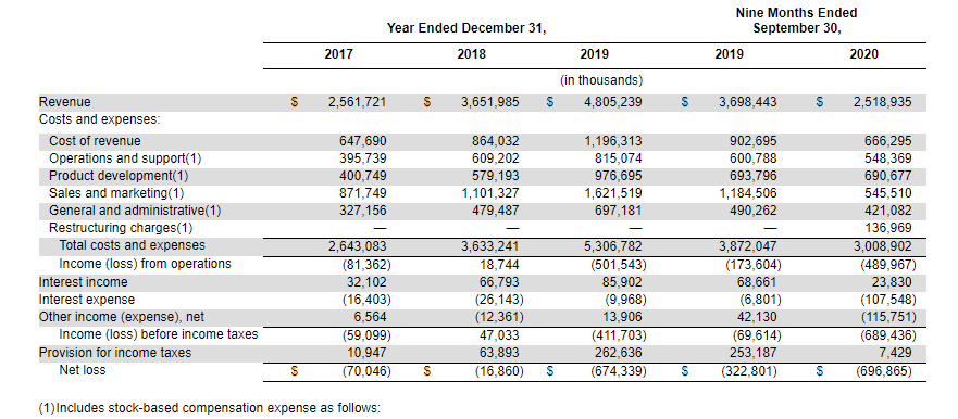 根据招股书,2019年公司营收48.05亿美元,今年前9个月营收仅25.19亿美元,同比下滑31.89%,净亏损近6.97亿美元。对于业绩下滑原因,招股书归结为可能是由于疫情的影响,并称“今年早些时候,疫情遏制了休闲和商务旅行”。