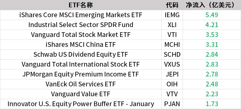 资金流入方面,美股大盘指数ETF、以及多只涵盖中概股的ETF出现小幅流入,其中,iShares Core MSCI Emerging Markets ETF净流入5.49亿美元,iShares Core MSCI Emerging Markets ETF净流入3.53亿美元,iShares MSCI China ETF净流入3.31亿美元;
