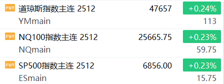 12月3日,美股三大股指期货上涨,截止发稿,道指期货涨0.24%,纳指期货涨0.23%,标普500指数期货涨0.23%。