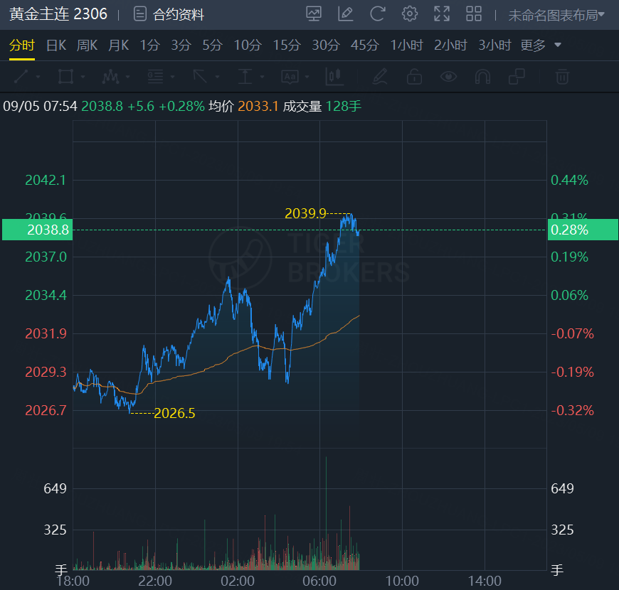 黄金期货小幅上涨,截止发稿,涨0.28%,报2038.8美元/盎司。