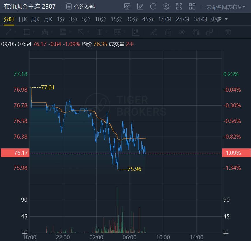 原油期货震荡走低,截止发稿,WTI原油跌1.11%,报72.35美元/桶;布伦特原油跌1.09%,报76.17美元/桶。