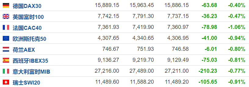 欧洲主要股指全线下跌,截至发稿,德国DAX30指数跌0.4%,英国富时100跌0.47%,法国CAC40跌1.06%。
