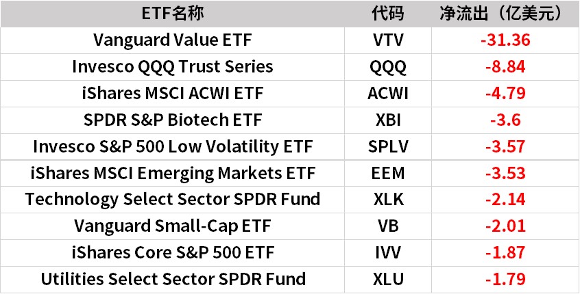 行业方面,SPDR S&P Biotech ETF、Technology Select Sector SPDR Fund、Utilities Select Sector SPDR Fund生物科技、高科技、公共事业等相关行业上周资金流出明显,分别净流出3.6亿美元、2.14亿美元、1.79亿美元;