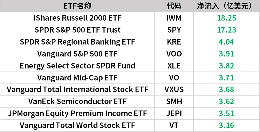 资金流入方面,据彭博数据显示,iShares Russell 2000 ETF、SPDR S&P 500 ETF Trust上周资金流入居前,分别流入18.25亿美元、17.23亿美元;