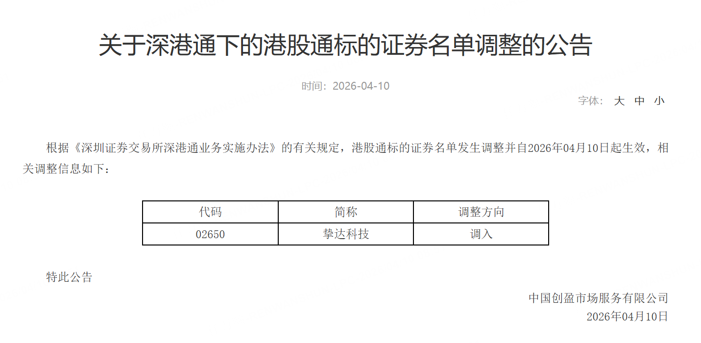 深交所公告,港股通标的证券名单调入挚达科技,2026年04月10日起生效。