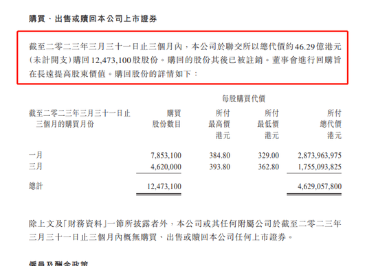 腾讯的回购已经司空见惯。腾讯一季报曾详细披露,今年1月至3月,腾讯合计回购了1247.31万股股份,合计总代价46.29亿港元,回购最低价329港元,回购最高价393.8港元,回购股份均已被注销。