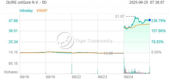 uniQure N.V.股价飙升248%,得益于其亨廷顿病基因疗法试验成功,该消息也推动了其合作伙伴 ClearPoint Neuro, Inc. 的股价上涨59%。