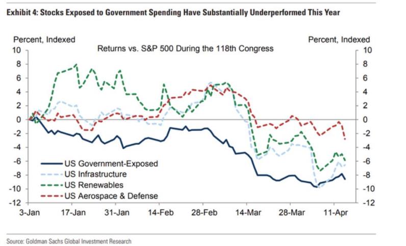 与此同时,高盛分析师表示,“政府支出敞口较大的公司的股票,也显示出债务限额风险定价的更大迹象”。他们指出,一篮子美国股票的交易至少有20%与政府支出有关,今年落后于标普500指数约9%涨幅。