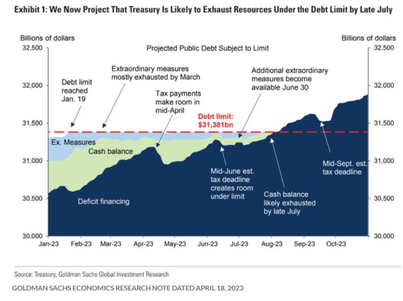 高盛分析师在本周二发布的一份经济研究报告中表示:“我们一直预测,财政部可能在8月初之前不增加债务限额。目前,我们认为截止日期在7月下旬的可能性略大,但如果税收继续不足,债务上限最后截止日期很容易在为6月初到来。”