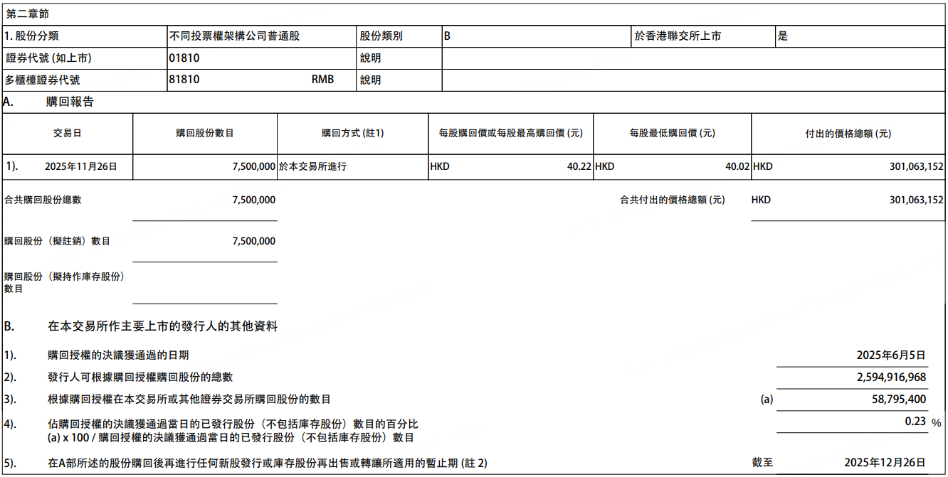 11月26日,小米集团11月26日回购了750万股B类股份,耗资3.01亿港元。