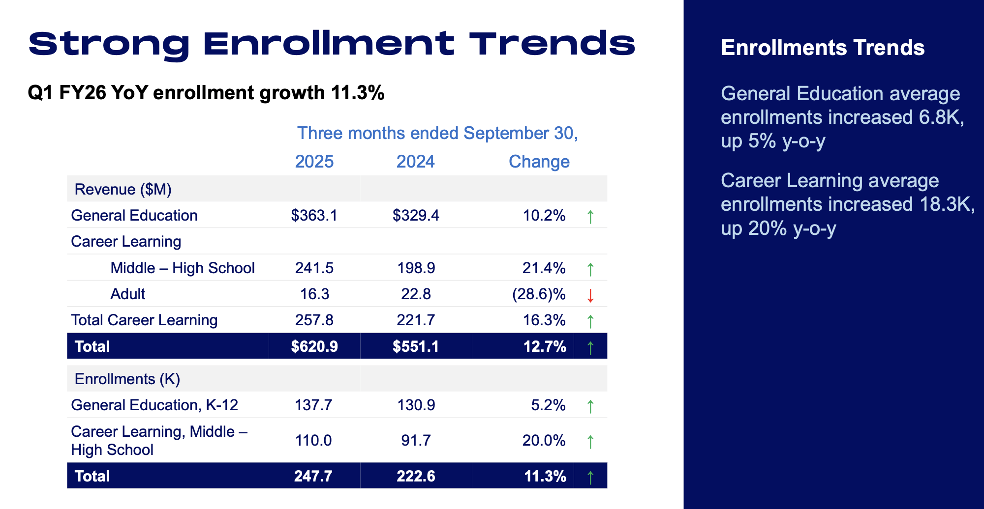 截至目前,学生入学情况依然健康。正如下图所示,公司在K-12的普通课程中实现了5%的同比增长,而职业学习项目新增了18,000名新学员,同比增长20%。