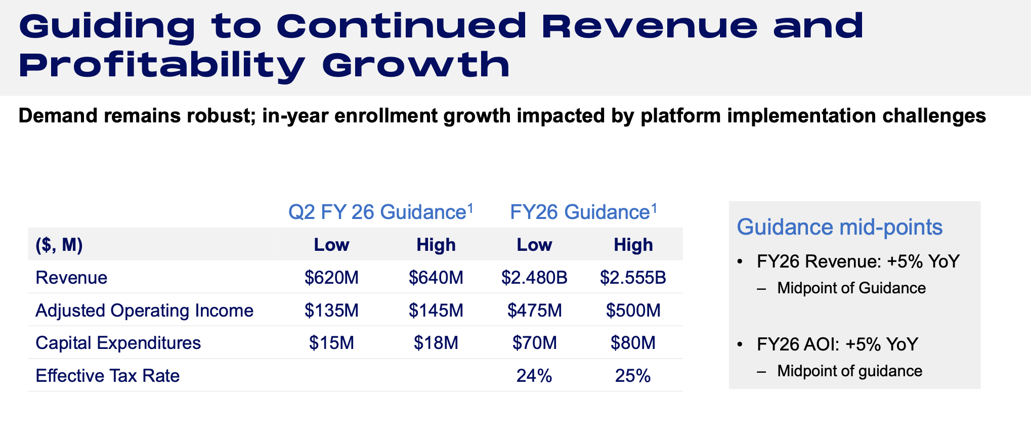 Stride预计2026财年收入在24.8亿到25.55亿美元之间,这意味着全年的收入增长仅为5%。公司提到,增长放缓部分是由于技术实施未按计划进行,导致了比预期更高的退学率。考虑到公司第一季度实现了13%的收入增长,这一指引暗示下半年将出现大幅放缓,令人失望。与此同时,华尔街的财年预期为26.7亿美元,增长为11%。