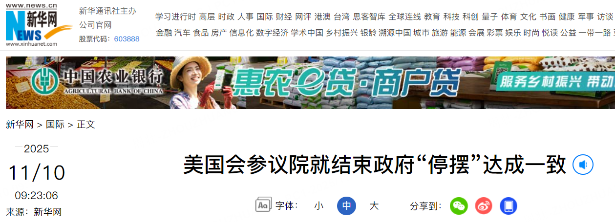 美国国会参议院已就结束联邦政府“停摆”达成一致