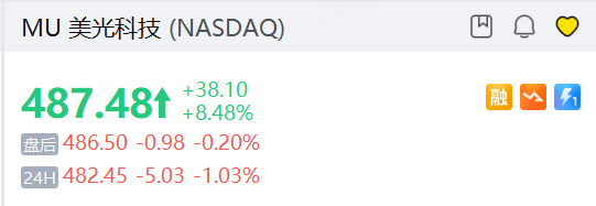 周三,受益于科技股整体反弹,美光科技股价上涨8.48%,收于475.50美元,夜盘跌1.03%,该股过去一年累计涨幅已达540%。