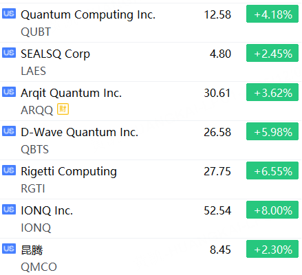 12月4日,量子计算概念股上涨,IONQ Inc.上涨8%,Rigetti Computing张超6%,D-Wave Quantum Inc.涨近6%,Quantum Computing Inc.涨超4%,Arqit QuantumInc.涨超3%,SEALSQ Corp、昆腾涨超2%。