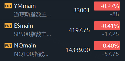 5月31日,美股指期货全线走低,截止发稿,道指期货跌0.27%,纳指期货跌0.4%,标普500指数期货跌0.41%;
