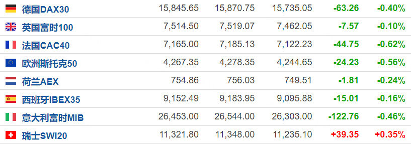 欧洲主要股指多数下跌,截至发稿,德国DAX30指数跌0.4%,英国富时100跌0.1%,法国CAC40跌0.62%。