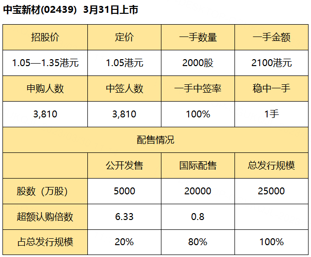 公开发售阶段中宝新材获约6.33倍认购,分配至公开发售的发售股份最终数目为5000万股,占发售股份总数的约20%(任何超额配股权获行使前)。合共接获3810份有效申请,一手中签率100% ,认购1手稳中1手。