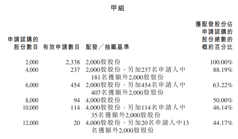 甲组每手2000股,一手中签率100%,申购1手稳中一手。