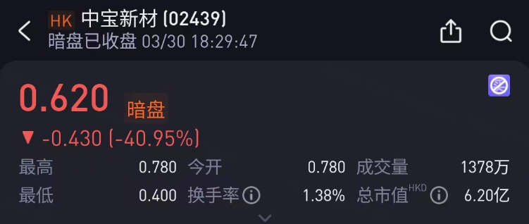 3月30日周四,中宝新材老虎证券暗盘收报0.62港元,较招股价1.05港元跌40.95%。每手2000股,不计手续费,每手亏860港元。