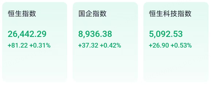 4月21日星期二,港股主要指数集体高开。恒生指数上涨0.31%,国企指数上涨0.42%,恒生科技指数上涨0.53%,红筹指数上涨0.31%,整体呈温和上行态势,市场风险偏好略有回暖。