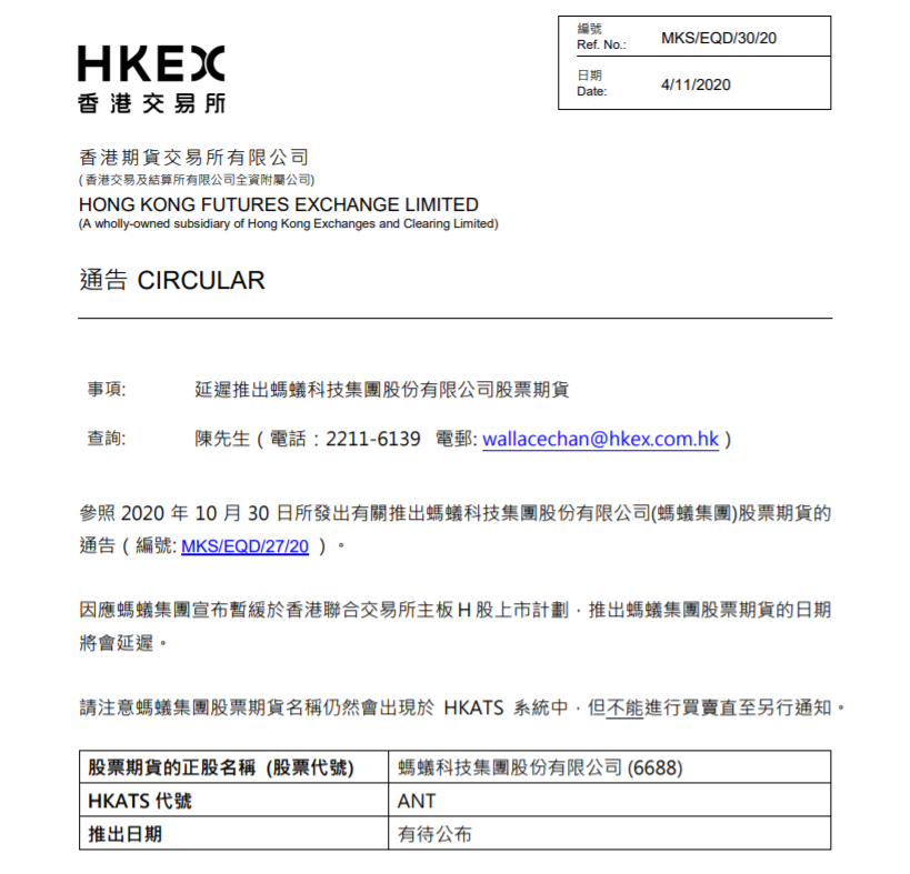 港交所:因应蚂蚁集团宣布暂缓于香港联合交易所主板H股上市计划,推出蚂蚁集团股票期货的日期将会延迟。