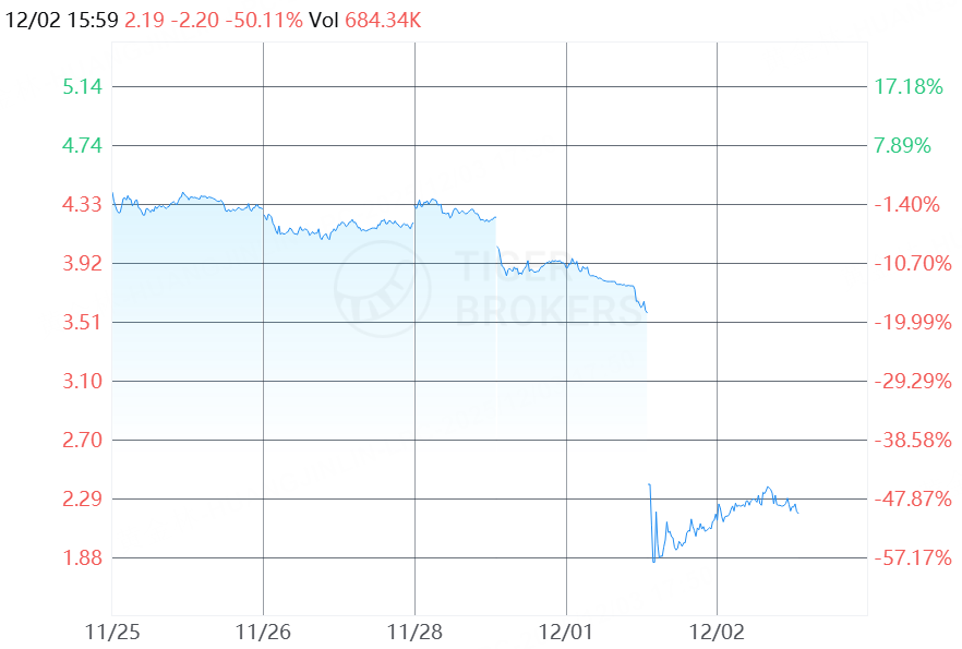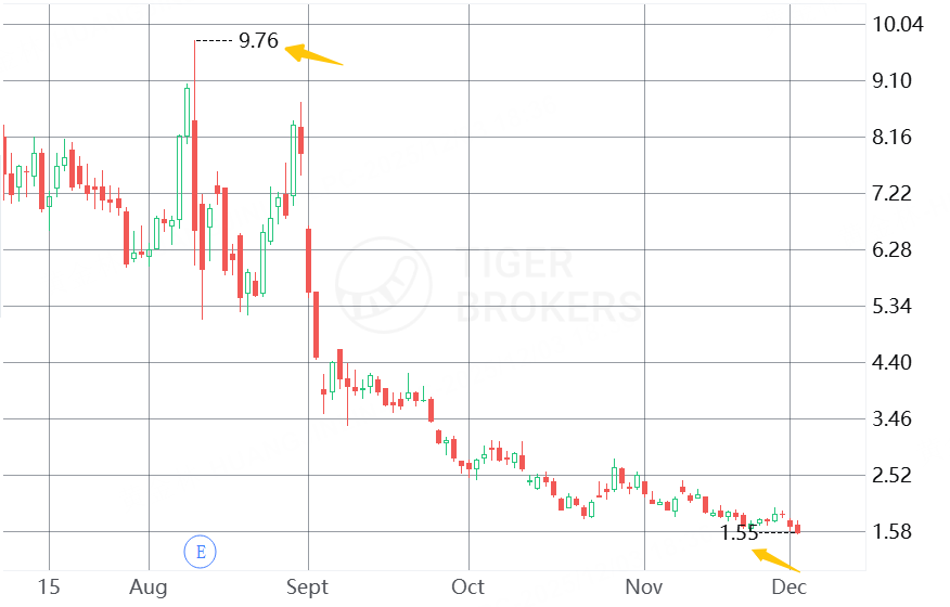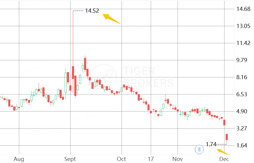 值得一提的是,该公司从9月3日最高点14.52美元,暴跌到昨日最低的1.74美元,累计最高暴跌达88%。