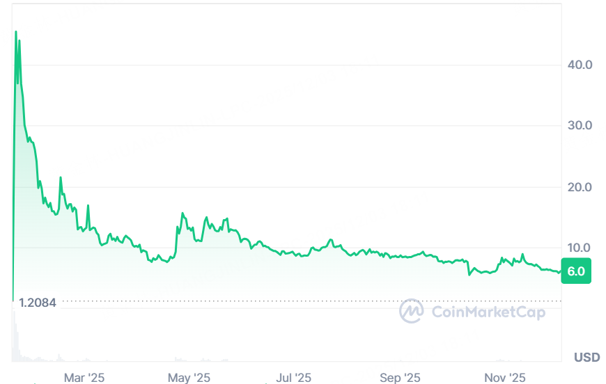 特朗普的官方Meme币 TRUMP 自1月推出以来,根据CoinMarketCap的数据,从最高的75.35美元跌至现在的6美元,最大跌幅达91.94%。