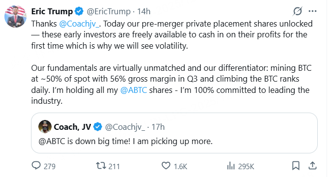 Eric Trump在X发文表示,由于锁定期结束,早期投资者‘首次可自由兑现其利润’,这导致股票出现下行波动。