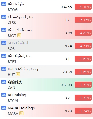 加密货币概念普跌,Bit Origin跌超9%,CleanSpark跌超5%