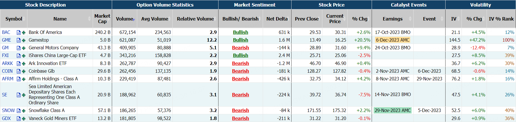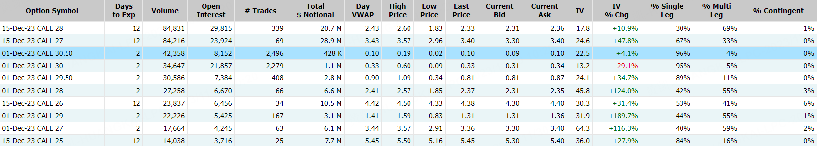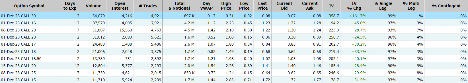 游戏驿站隔夜飙涨20%,期权合约成交60.20万张。较90日平均成交量扩大12倍,其中看涨期权占全部期权交易的81%。12月1日到期的30美元的行权看涨期权交易量特别高,共有54,079份合约交易。