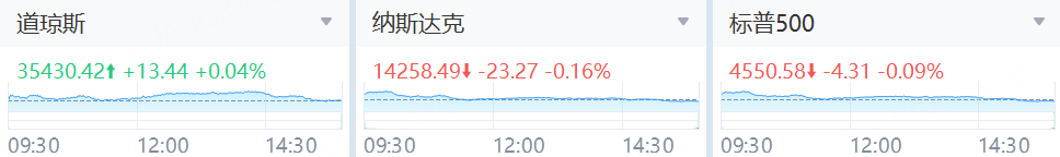 周三(11月29日)美股三大指数涨跌不一。截至收盘,道琼斯指数涨0.04%,报35,430.42点;标普500指数跌0.09%,报4,550.58点;纳斯达克综合指数跌0.16%,报14,258.49点。