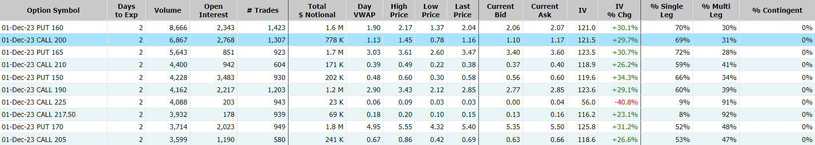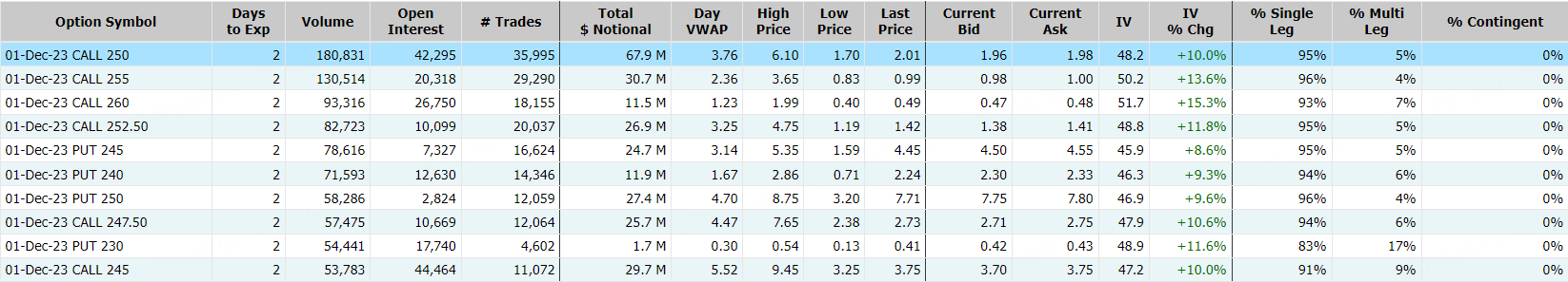 特斯拉隔夜收跌1.05%,期权合约成交239.3万张。12月1日到期的250美元的行权看涨期权交易量特别高,共有180,831份合约交易。