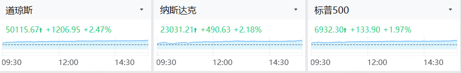 周五,美股市场“逢低买入”情绪全面爆发,道指也历史性地站上了5万点关口。截至收盘,截至收盘,标普500指数涨1.97%,报6932.3点;纳斯达克综合指数涨2.18%,报23031.21点;道琼斯工业平均指数涨2.47%,报50115.67点。