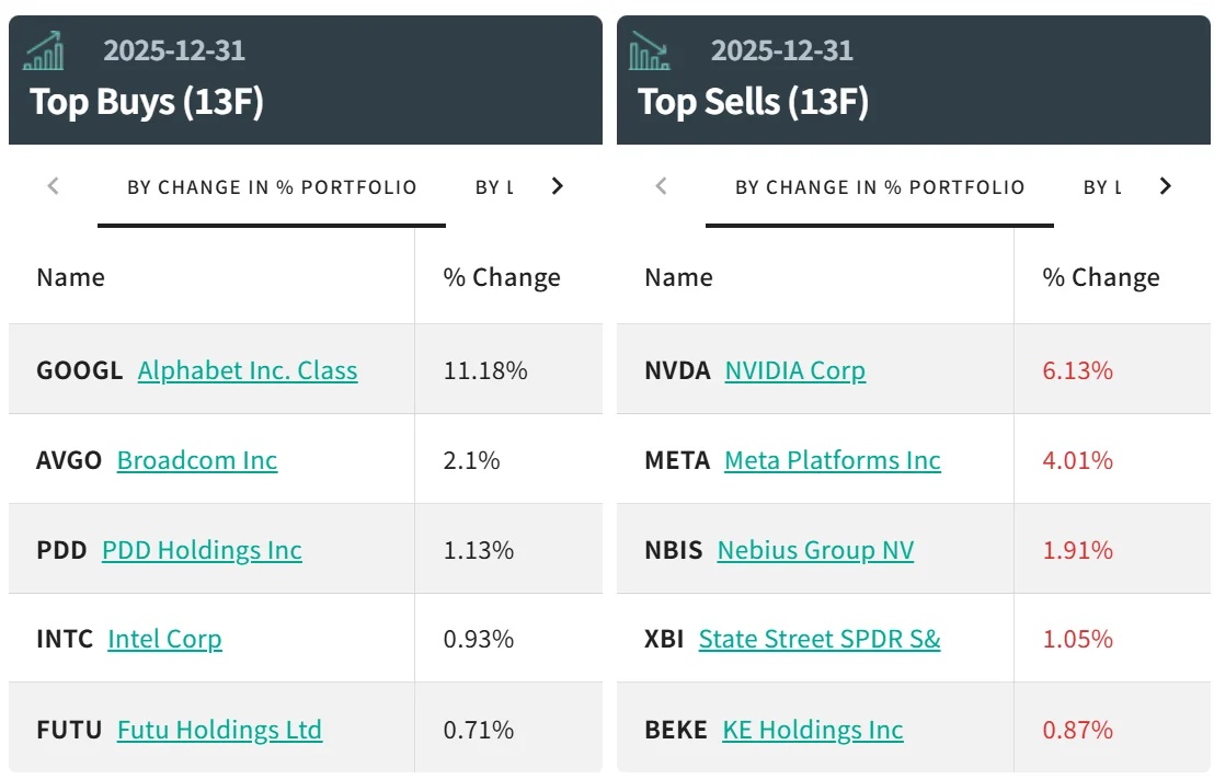在减仓操作中,景林去年最后一个季度砍掉了超6成的英伟达持仓。减仓了近两成的Meta Platforms ,后者因此跌落至第二大持仓。
